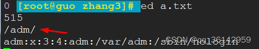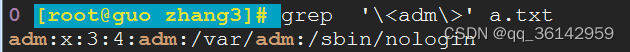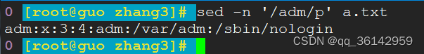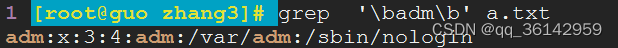 不指定行号,但要求查看包含字符串的行,这就用到字符的模式匹配,通过匹配查看多行文件内容。下面的案例,统一要求匹配“adm”(即第4行)。