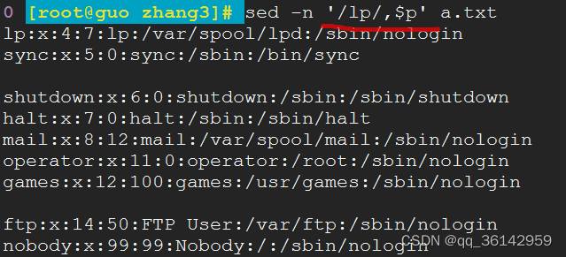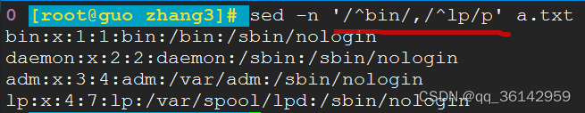 我们可以通过匹配/bin/和/lp/两个字符,查看包括这两行及其中间行的多行内容。