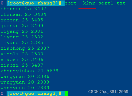 按数值排序,用-n选项;降序用-r选项。进行两项排序时,可以设置两个-k选项,分别设置排序选项。