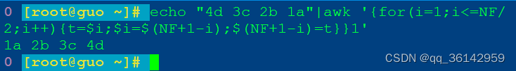 这是最常用的命令,利用NF的降序输出,把最后一个域作为第一个输出,然后自减,最后输出$1,这里要注意的地方是printf,不能用print,因为print默认的ORS是换行,最后用print $1单独输出,既换行,又不会多个空格。
