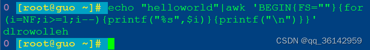echo "helloworld"|awk 'BEGIN{FS = ""}{for(i = NF; i >= 1; i--) {printf("%s", $i)}{printf("\n")}}'