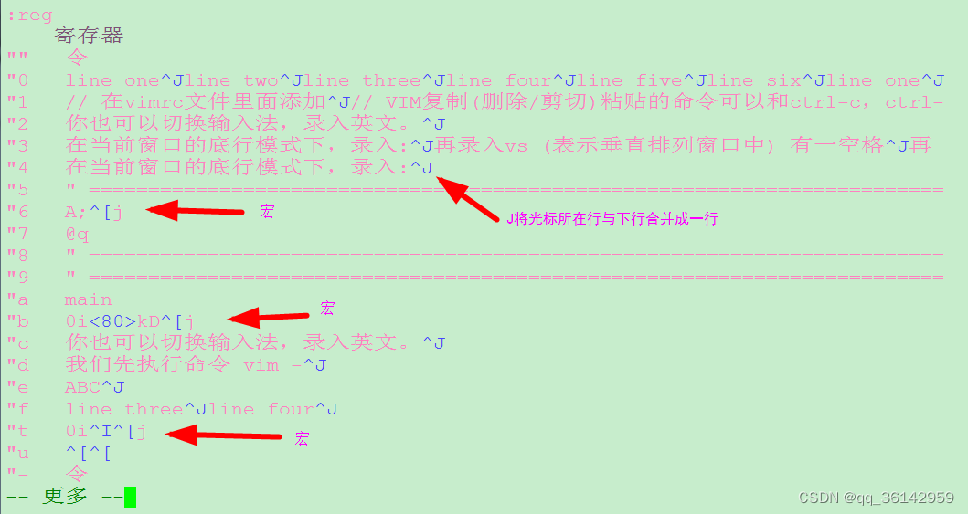 b.在任意一个文件的空白位置,在normal状态下,执行命令"{register}p即可以把宏的内容粘贴出来。比如说,一个"t寄存器中的宏是: