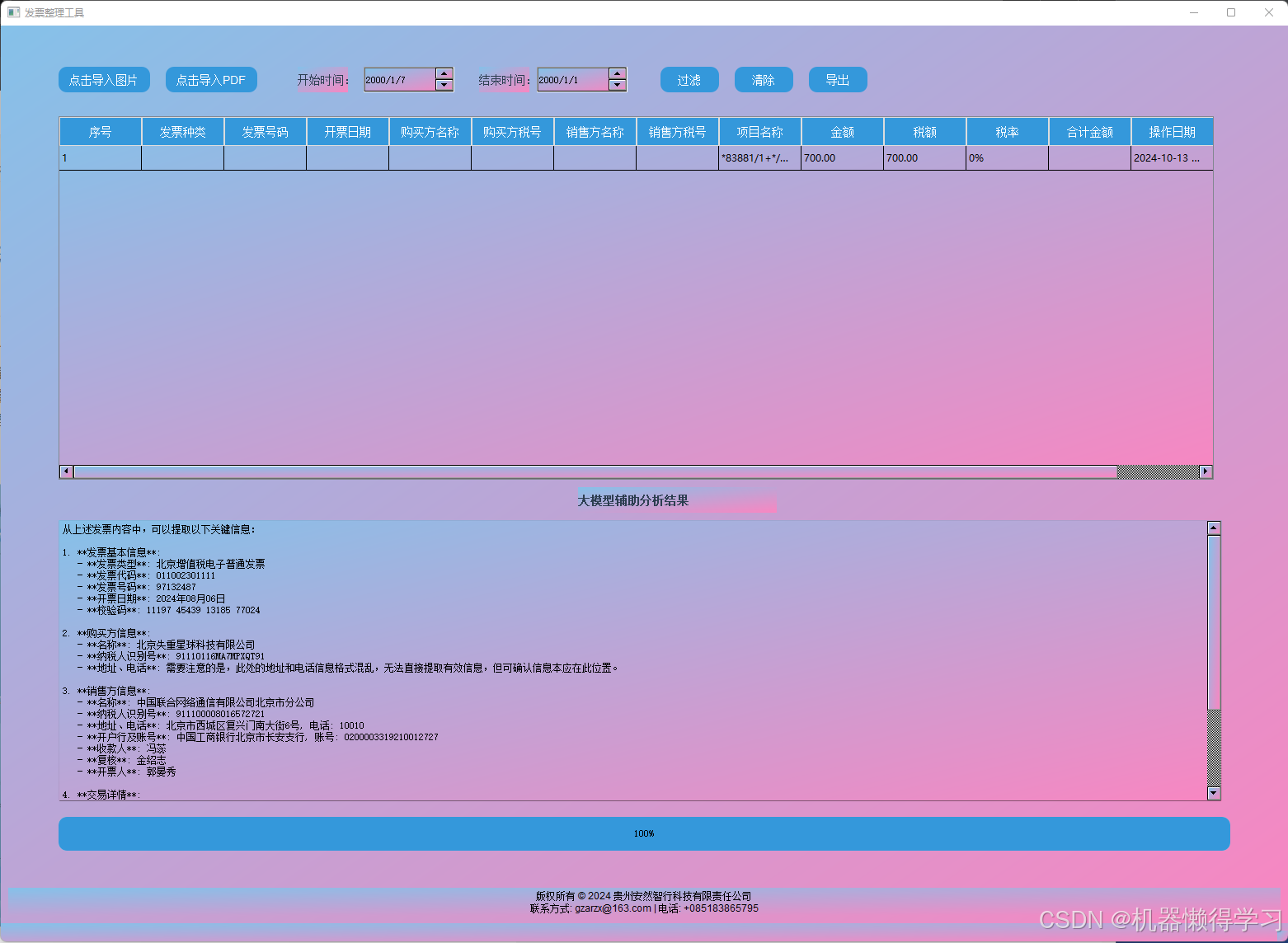 随着现代企业数字化转型的不断深入,企业财务管理和税务合规面临着大量的发票处理需求。传统的发票录入方式依赖于大量人工,效率低下且容易出错。如何实现发票自动化处理和智能分析,成为了提升企业财务运营效率的关键点。为了解决这些痛点,我们开发了一款基于Python的发票智能识别系统,能够快速处理图片或PDF格式的发票,并通过大模型进行智能分析。