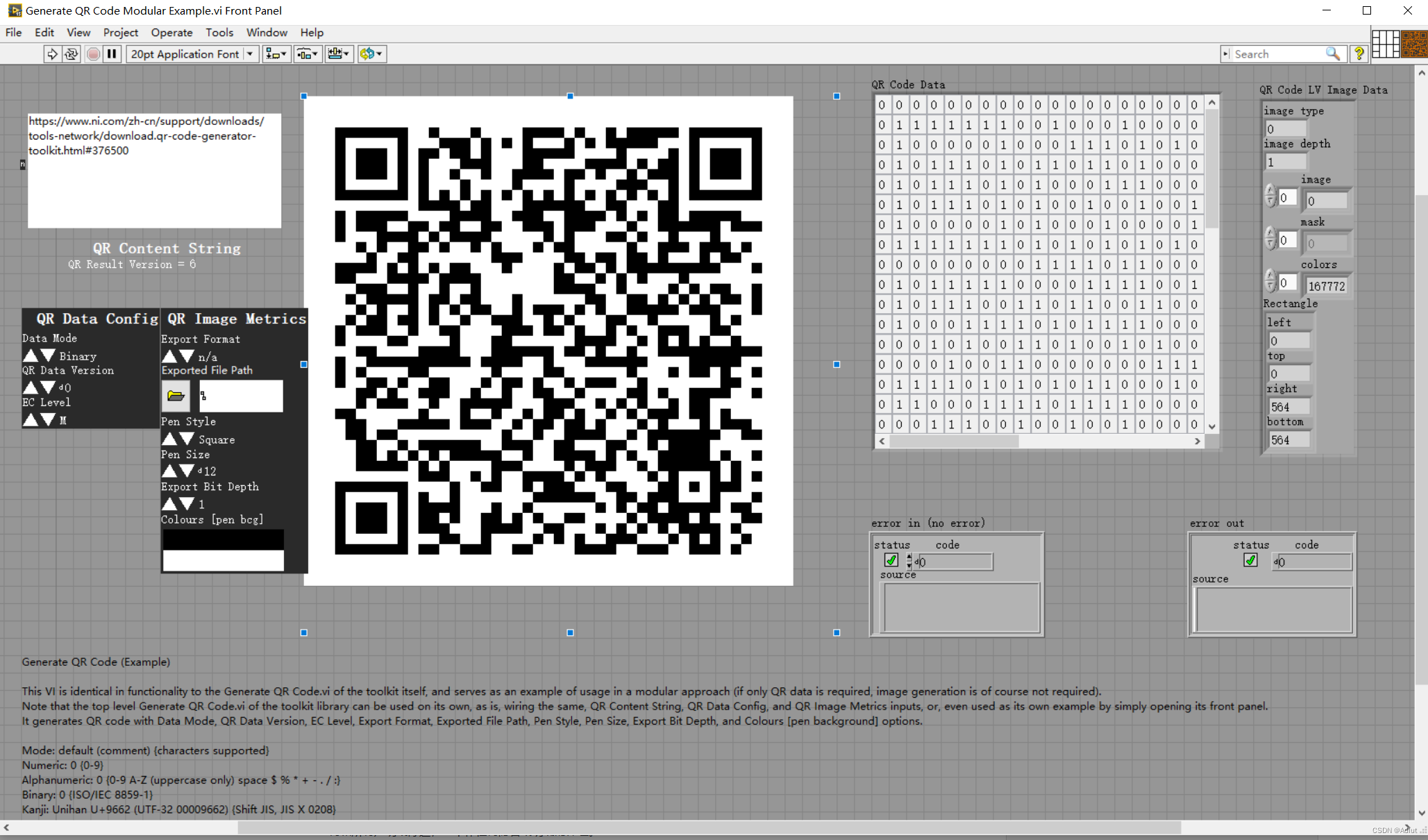 关于如何使用的案例在 */National Instruments\LabVIEW 20**\examples\Lexcom Consultants\Lexcom Consultants QR Code Generator Toolkit/Generate QR Code Modular Example.vi下,打开后程序运行截图如下: