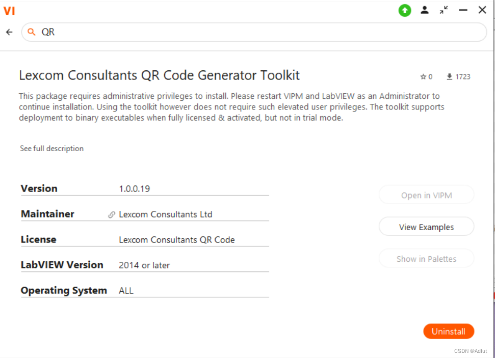 通过 VIPM 来下载工具包来下载,注意安装时需要管理员权限来运行
