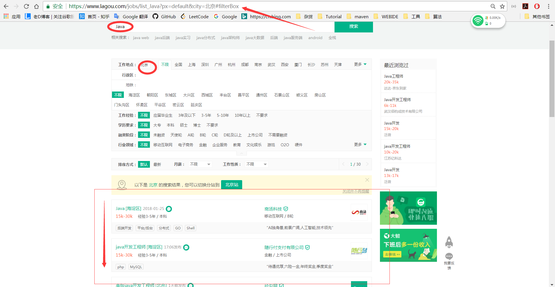 所有的职位信息都在这了,当然这也是固定页的职位信息,当页数不一样时,传递的职位信息不一样,这个需要考虑到post请求,后面会讲到。好,接下来,正式爬取。请看代码