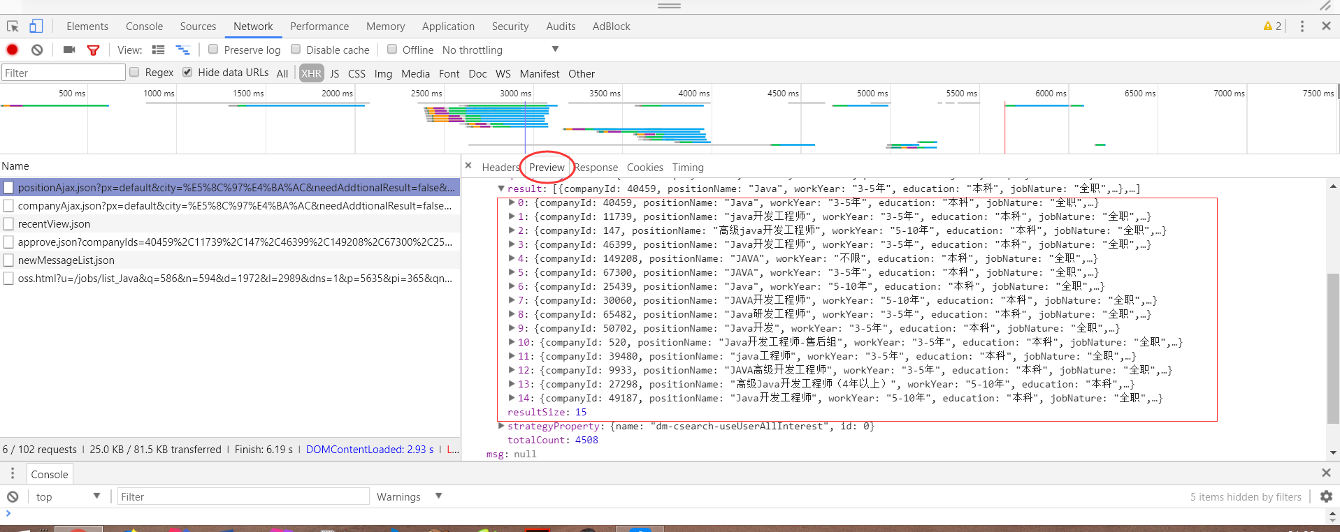 点击xhr(XmlHttpRequrest)F12后,可以看见以上ajax链接,从名字便可以看出来,第一个便是我们所需要的职位信息,点击链接查看详细信息。