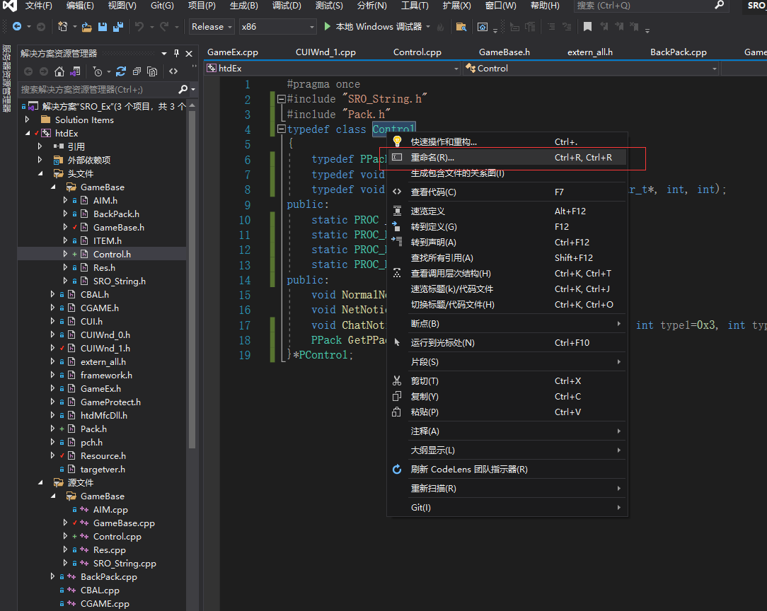 修改类名或变量名:通过下图红框的重命名来修改的,它可以把使用到的位置全部修改掉,使用很简单,点击之后会弹框,然后输入新名字,然后点预览,如果预览看着没问题,然后再点应用,就修改类名或变量名成功了,但是这个不能修改文件名,所以文件名修改之后每个#include它的位置都要手动修改,可以通过重新编译项目出错来定位哪里#include了