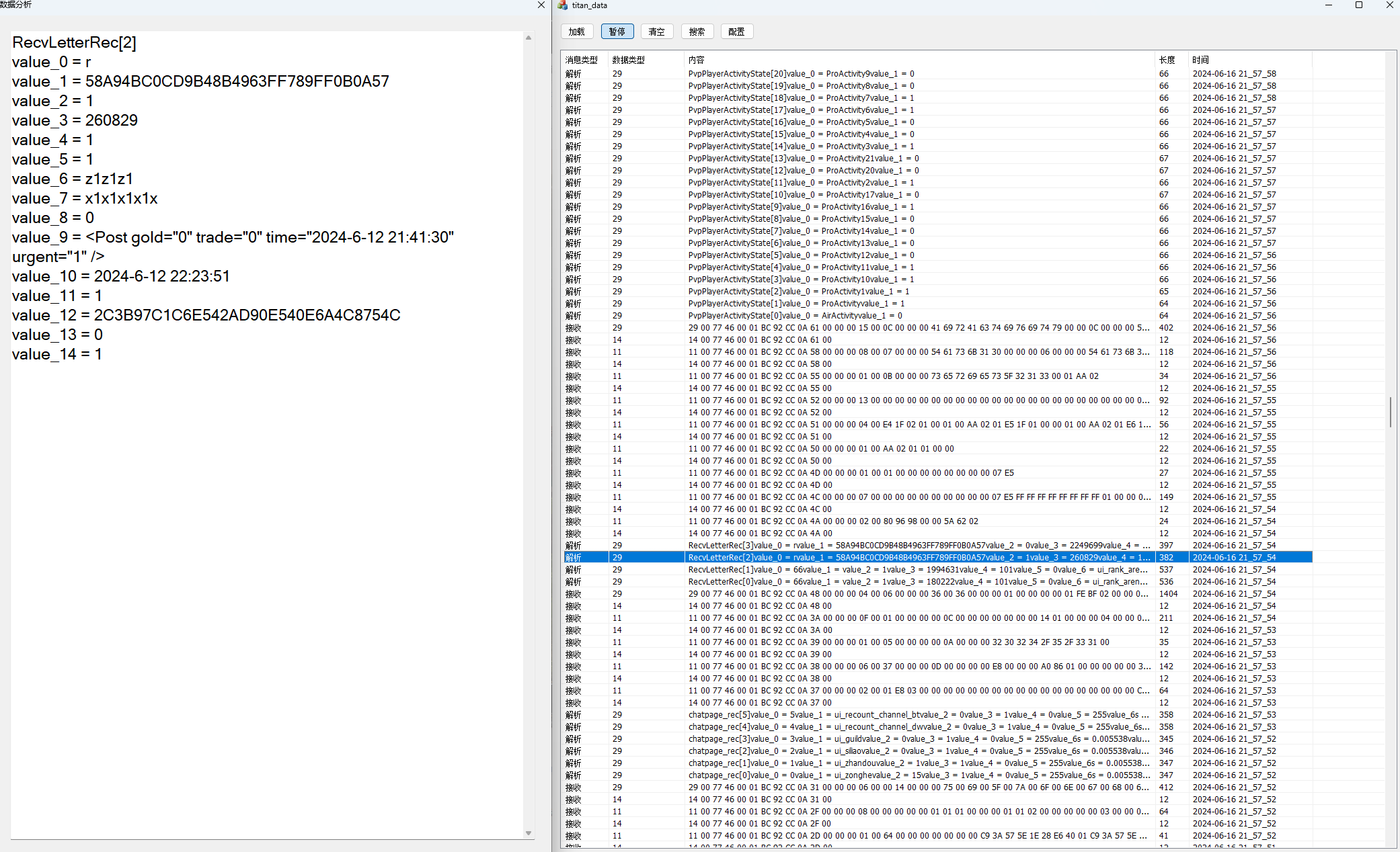 为了后续分析方便,现在把29数据包解析然后发到日志记录里面,也就是 DataAnly.exe 的列表里,然后后面看的时候就知道它里面都是写什么东西了,知道这些东西之后将来处理起来会比较轻松