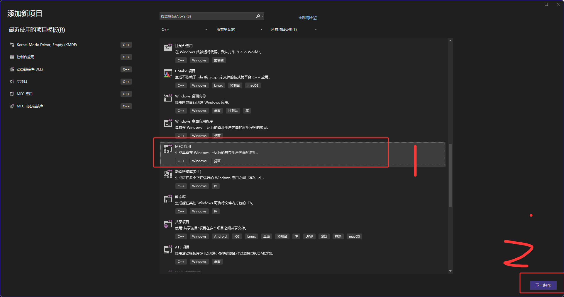 首先创建一个MFC的项目,如下图右击选择新建项目