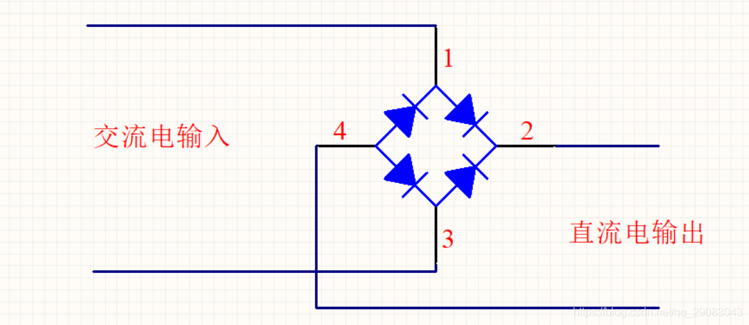 输出直流电压 = 输入交流电压的有效值 * 0.9 - 第二种情况:2和4之间接了电容(一般是极性电容,用作储能),然后再接负载。