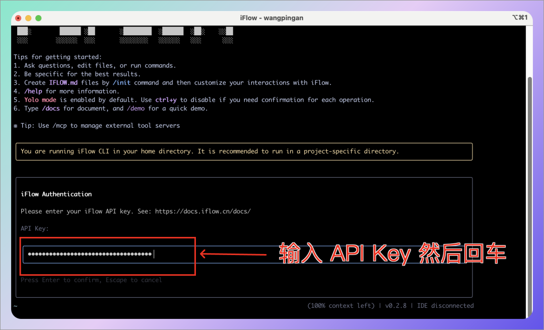 接着选择 iFlow 认证方式,然后将复制的 API Key 粘贴到终端中,回车即可配置完成: