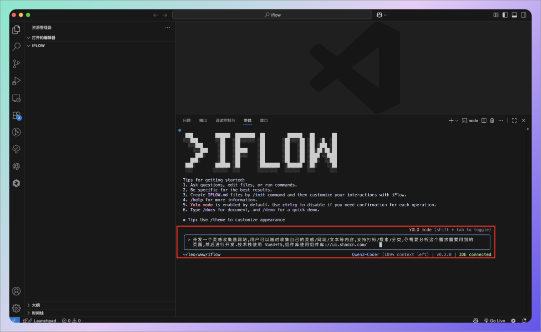 接下来 Chris 让 iFlow CLI 使用 Qwen3-Corder 模型开发一个灵感收集网站,提示词如下: