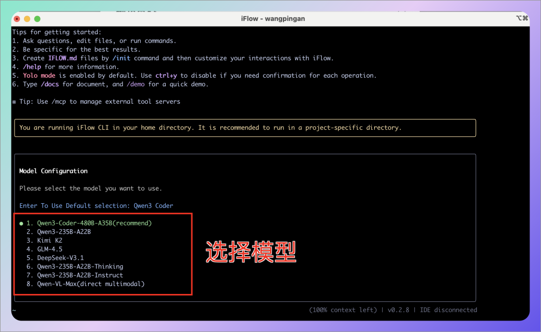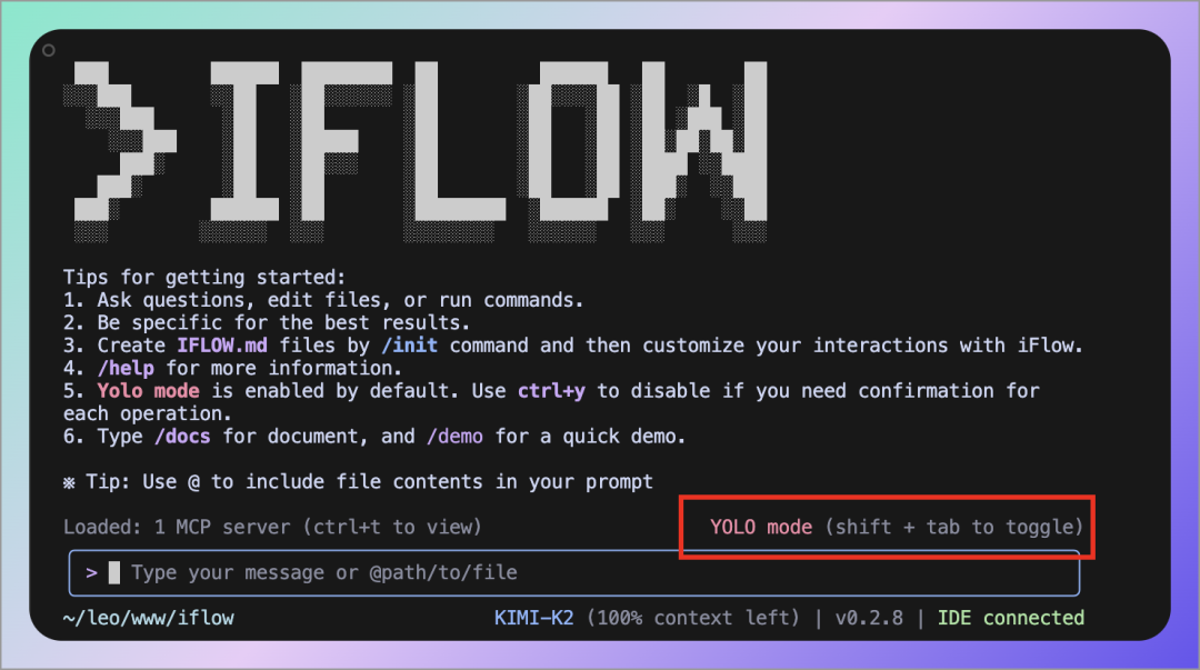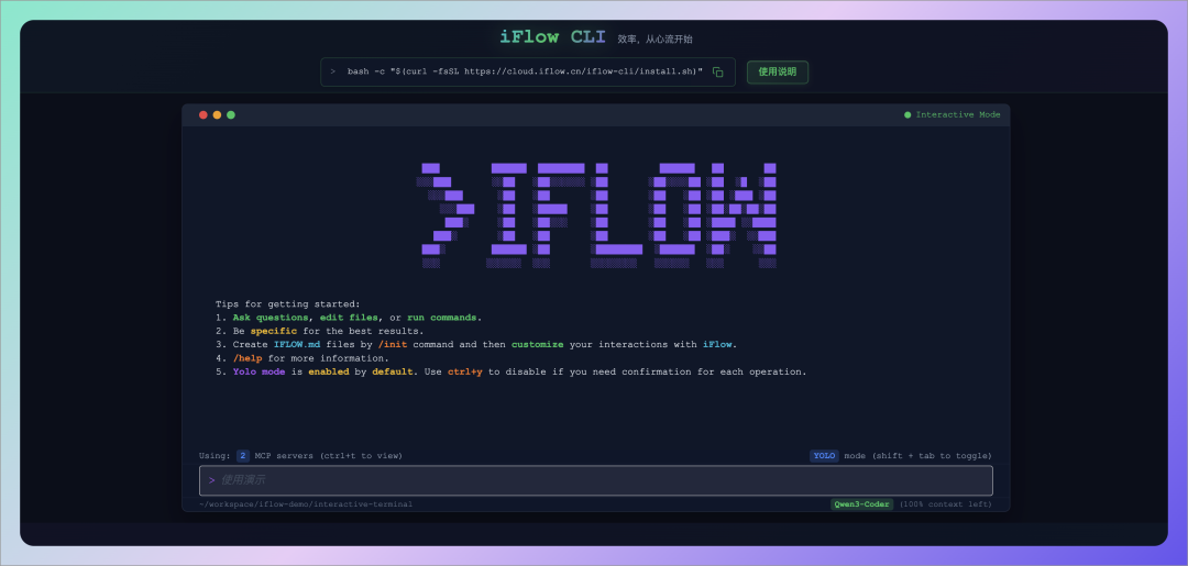安装成功后会显示很大的 iFlow Logo和使用教程: