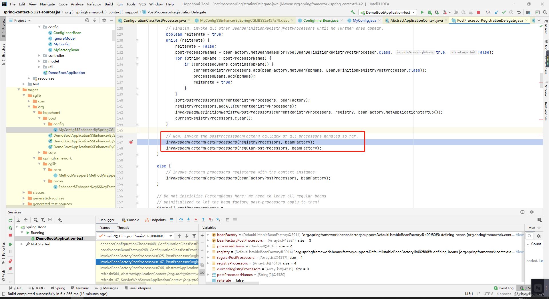 【一】springboot启动源码 - invokeBeanFactoryPostProcessors - (下) 这里用来回调BeanDefinitionRegistryPostProcessors实现类的postProcessBeanFactory方法(该方法属于postProcessBeanFactory接口)遍历所有配置类,并通过cglib进行动态代理, enhancer.enhance(configClass, this.beanClassLoader);创建完代理类,将代理类设置为当前配置类的beanDefinition的beanClass。通过配置环境变量,可以保留cglib创建类的class文件。
