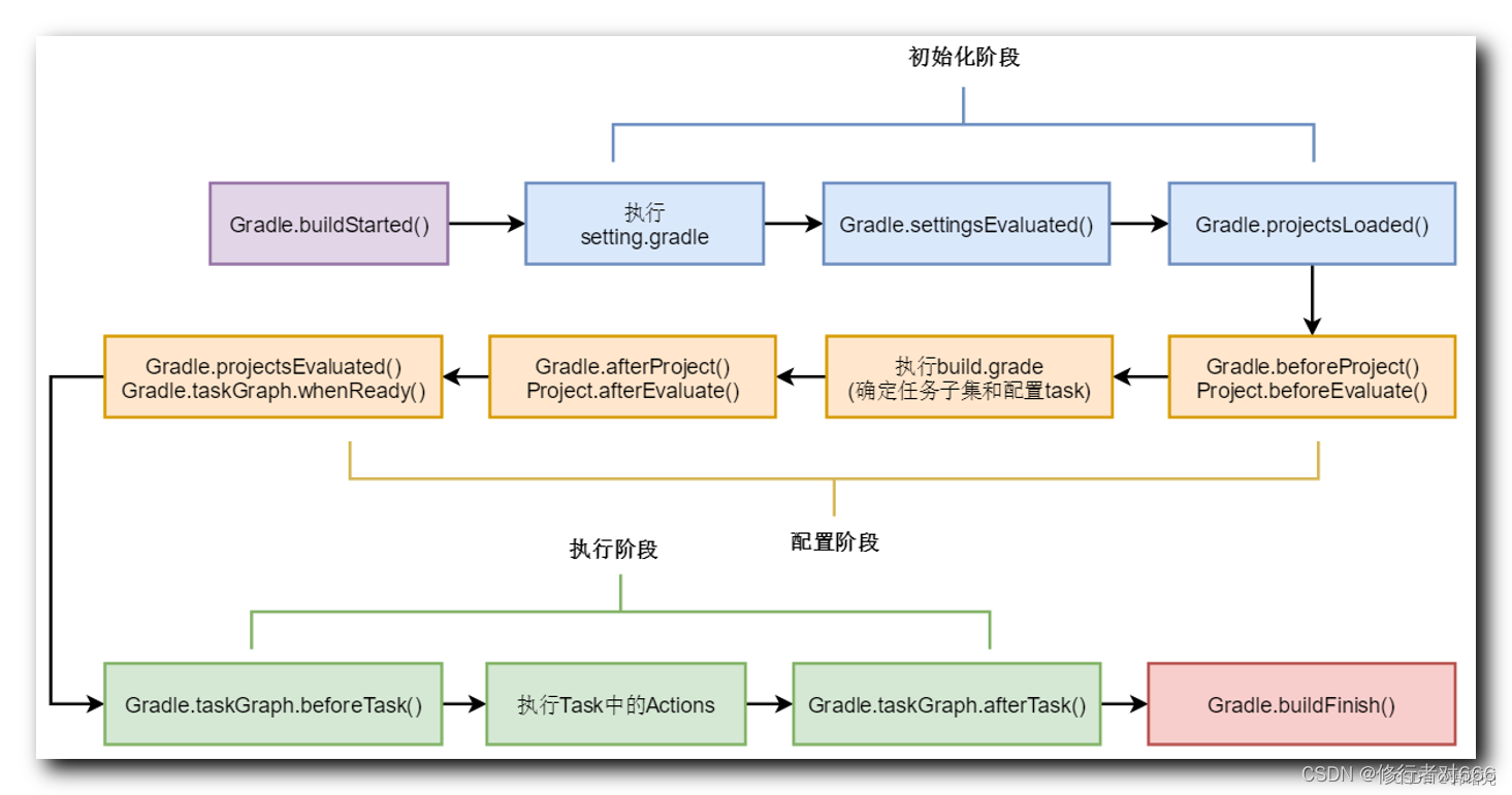 Gradle 构建生命周期 完整流程 : 下图中的函数 , 都可以作为 HOOK 点 , 监听拦截 Gradle 的执行流程 ;