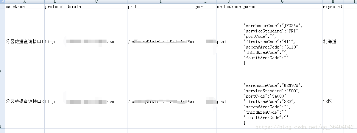 管理用例在excel中管理接口测试用例,模板如下,写完后记得要另存为.csv格式,不然是读取不了的(.txt和.dat也可以读取,但是不方便查看,最好是.csv)。 ps:坑1,直接用.xlsx格式,出来一堆乱码
