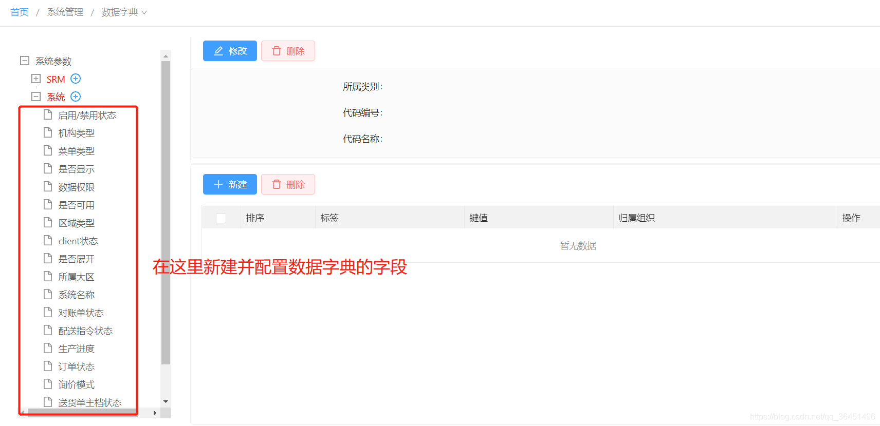 第一步,首先在系统的“数据字典”页面配置数据字典的名称、代码编号、便签和键值等信息: