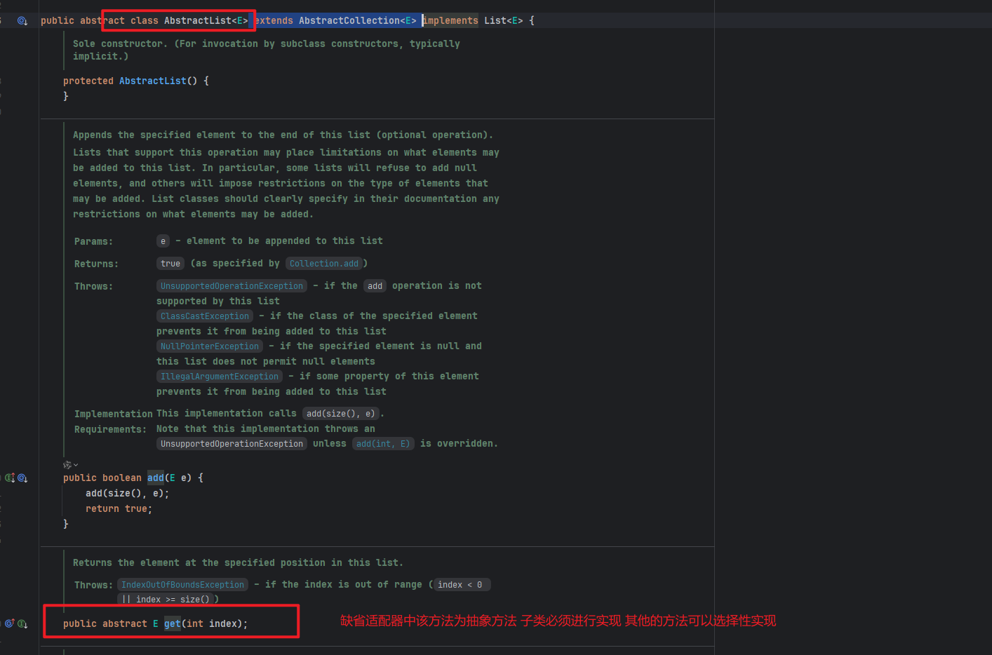 在我们子类中可进行选择性覆盖,只需要实现我们所有的抽象方法就可以了,像 addAll 这样的方法抽象类做了实现,子类可以选择不进行覆盖。