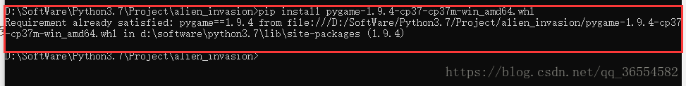 注意这个命令是只针对于1.9.4-cp37版本的pygame,如果是其他版本的pygame,我们只需要改成相对应的版本号即可。