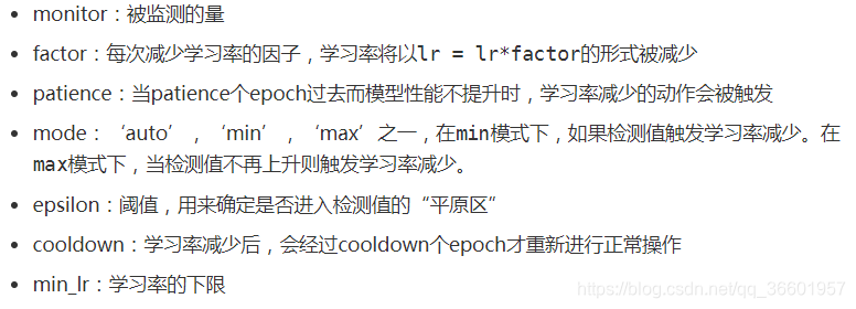 当学习停滞时,减少2倍或10倍的学习率常常能获得较好的效果。该回调函数检测指标的情况,如果在patience个epoch中看不到模型性能提升,则减少学习率