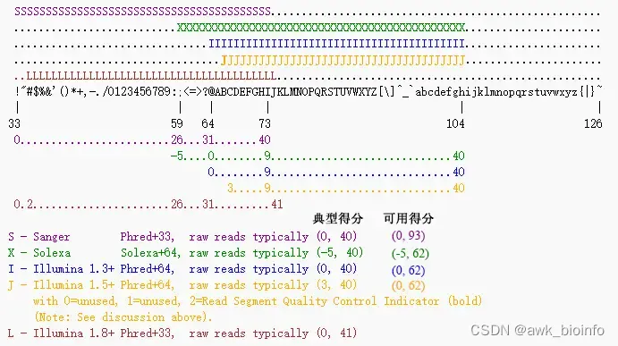 fastq文件Phred33/Phred64质量体系 如果有2个以上的质量字符ASCII值小于等于58(即有两个碱基的得分小于等于25),同时没有任何质量字符的ASCII值大于等于75,即判断是Phred+33。如果有2个以上的质量字符ASCII值大于等于75(即有两个碱基的得分大于等于10),同时没有任何质量字符的ASCII值小于等于58,即判断是Phred+64。= (碱基质量值 + 33)的ASCII值 —> 从第一个可见字符!= (碱基质量值 + 64)的ASCII值 —> 从@字符开始。互相转换脚本,待写。