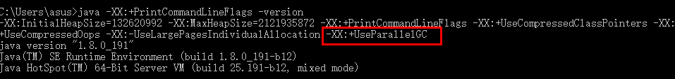 - -XX:+PrintCommandLineFlags:java -XX:+PrintCommandLineFlags -version(打印命令行参数,可以查看当前JVM使用的垃圾回收器)