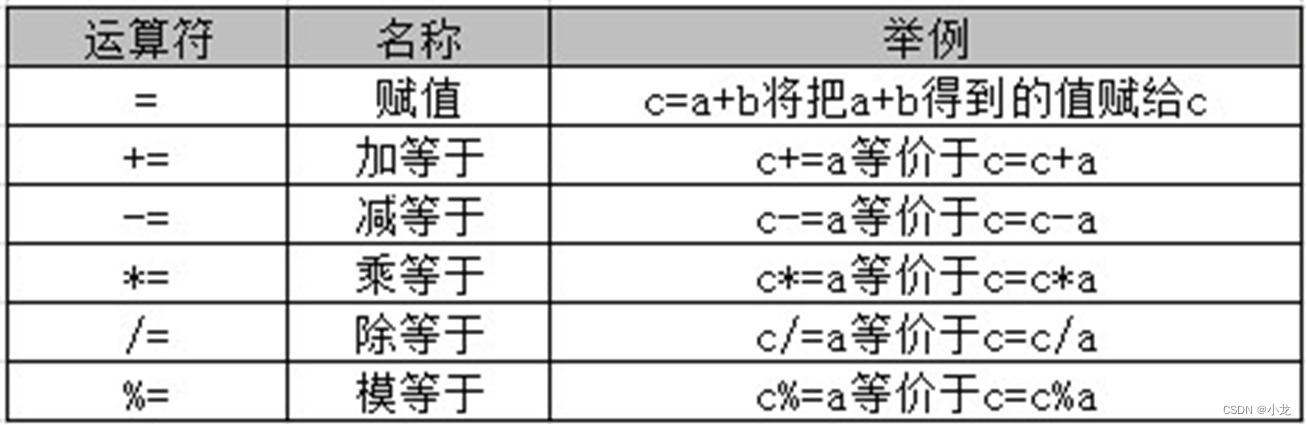 赋值运算符是指为变量或常量指定数值的符号。如可以使用 “=” 将右边的表达式结果赋给左边的操作数。