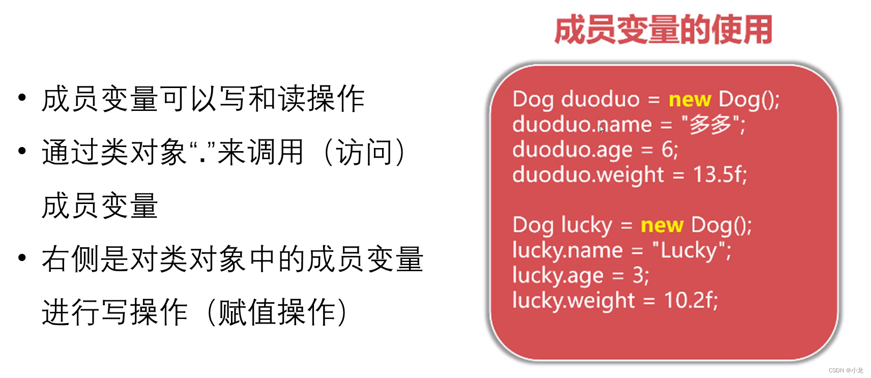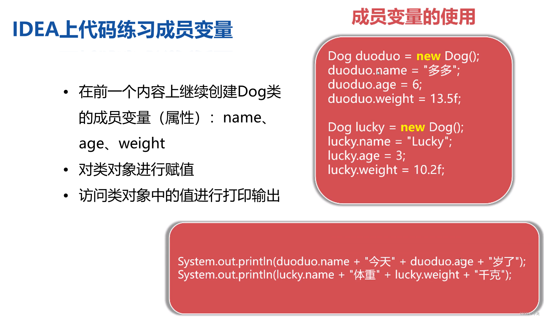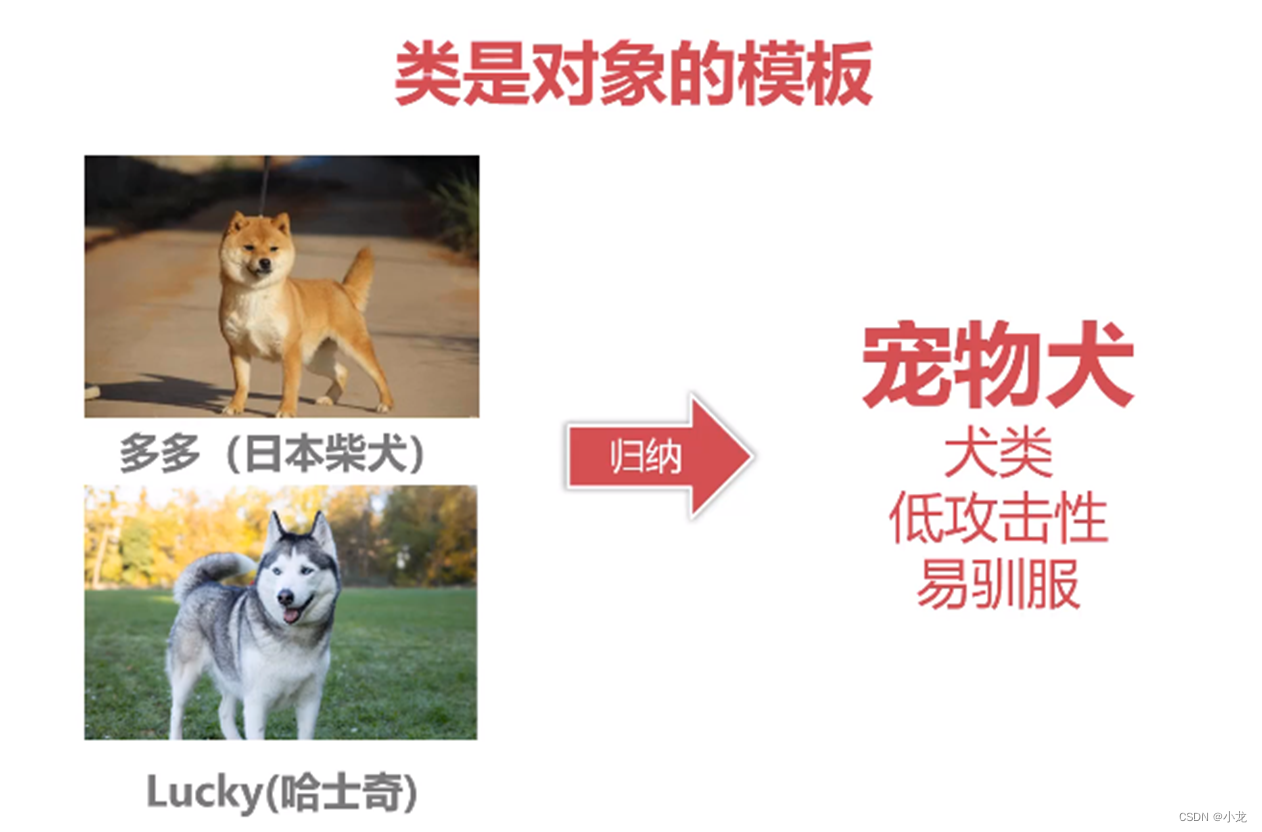 以下面这两只狗狗为例,这两个狗狗有不同的名字,可以定义一个犬类,然后实例化每一只具体的狗狗。