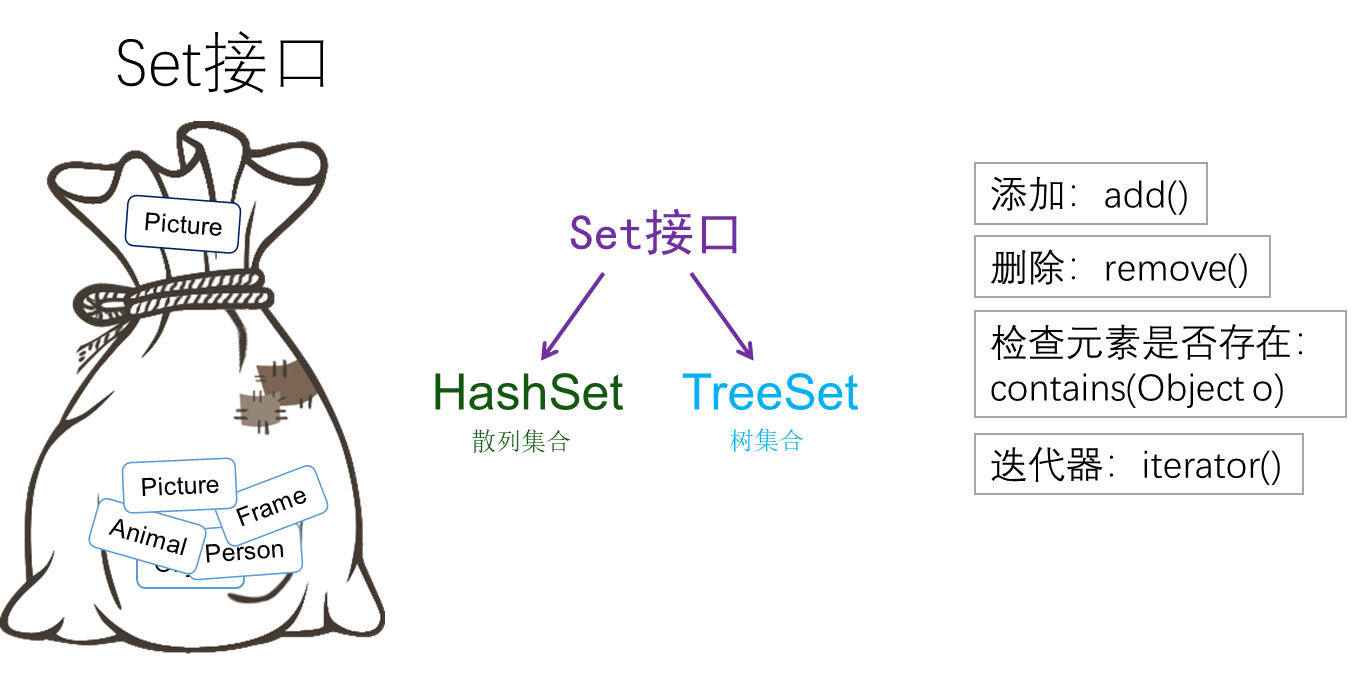 - Set接口主要有两个实现类,分别是HashSet和TreeSet。其中,HashSet是根据对象的哈希值来确定元素在集合中的存储位置,具有良好的存取和查找性能。TreeSet则是以二叉树的方式来存储元素,它可以实现对集合中的元素进行排序。