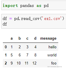 因为这个文件是逗号分隔的,我们可以使用read_csv将它读入一个DataFrame: