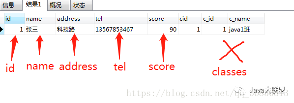 如图,id,name,address,tel,score属性可以对应字段,classes属性没有对应的字段,准确的讲,classes属性需要对应的对象为c_id,c_name封装起来的对象。