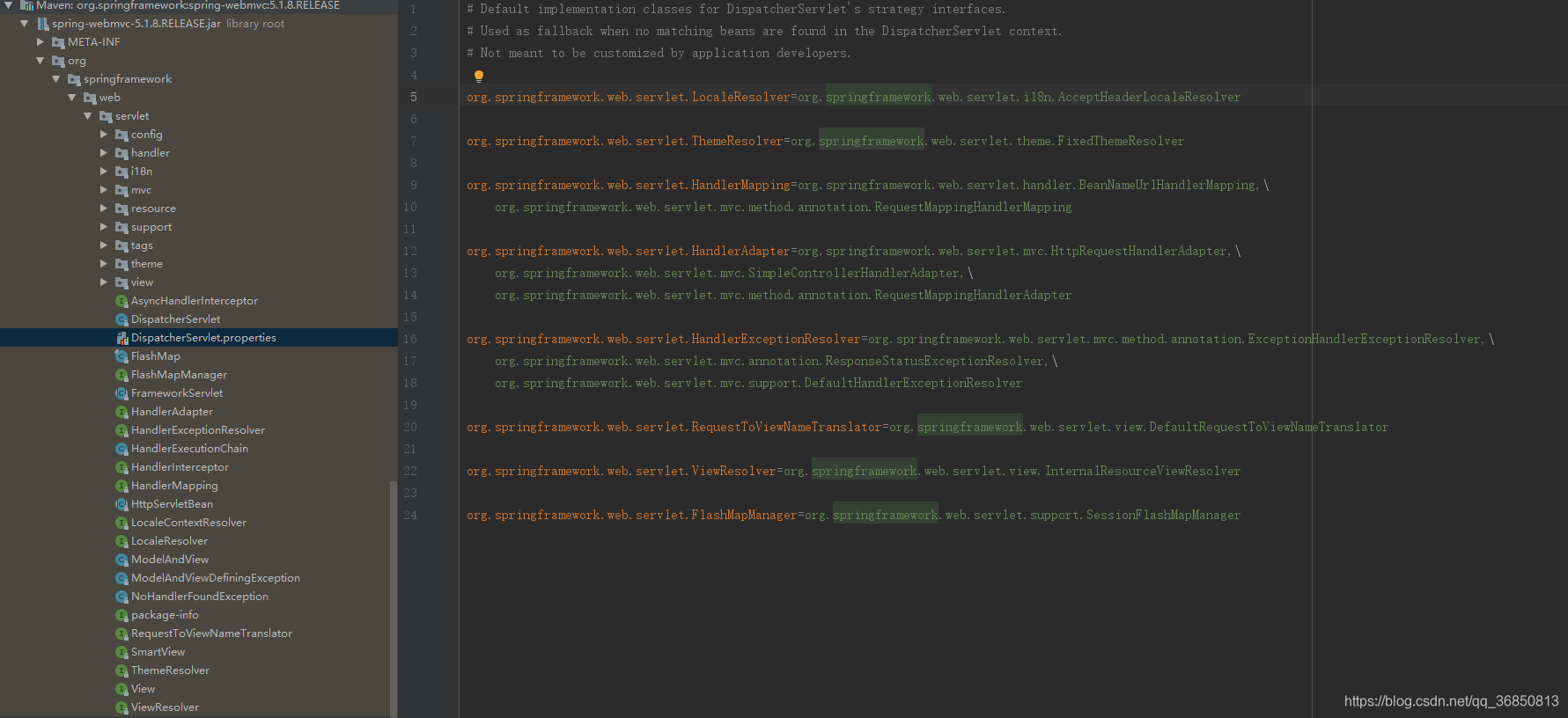 DispatcherServlet的默认配置在DispatcherServlet.properties(和DispatcherServlet类在一个包下)中,而且是当Spring配置文件中没有指定配置时使用的默认策略: