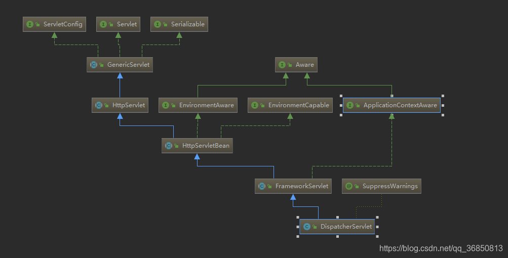 3.DispatcherServlet继承FrameworkServlet,并实现了onRefresh()方法提供一些前端控制器相关的配置。