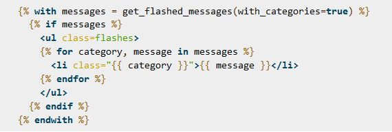 在Flask中,get_flashed_messages()默认已经集成到Jinja2模板引擎中,易用性很强。下面是来自官方的一个示例: