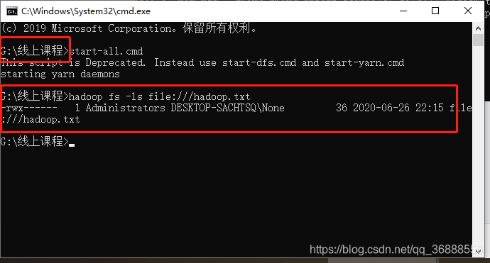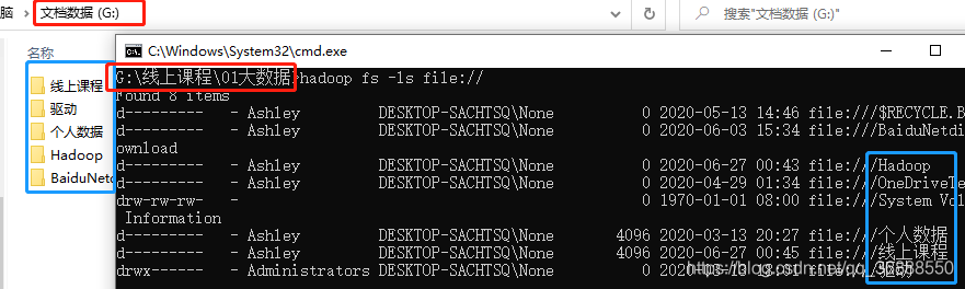 其中,file:///hadoop目录是hadoop这个软件在自动生成的文件夹,在哪个大盘打开,就在哪里生成