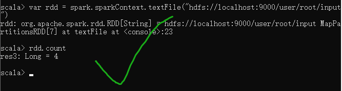 比如我的就改成 var rdd = spark.sparkContext.textFile("hdfs://localhost:9000/user/root/input")