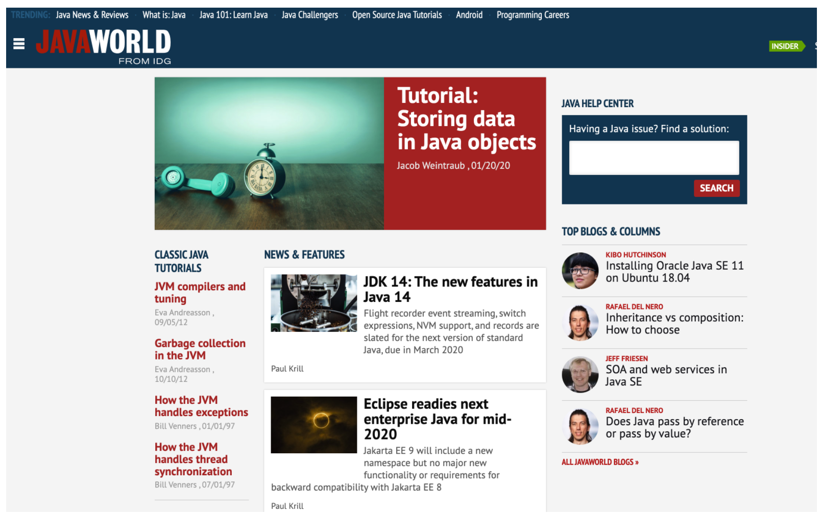 Java World 是一个纯 Java 学习网站,它里面包括很多 Java 文章,它不同于 DZone 的领域那么多,Java World 只专注于 Java,哦对了,还有安卓,是你提高视野,学习 Java 新特性不可或缺的网站