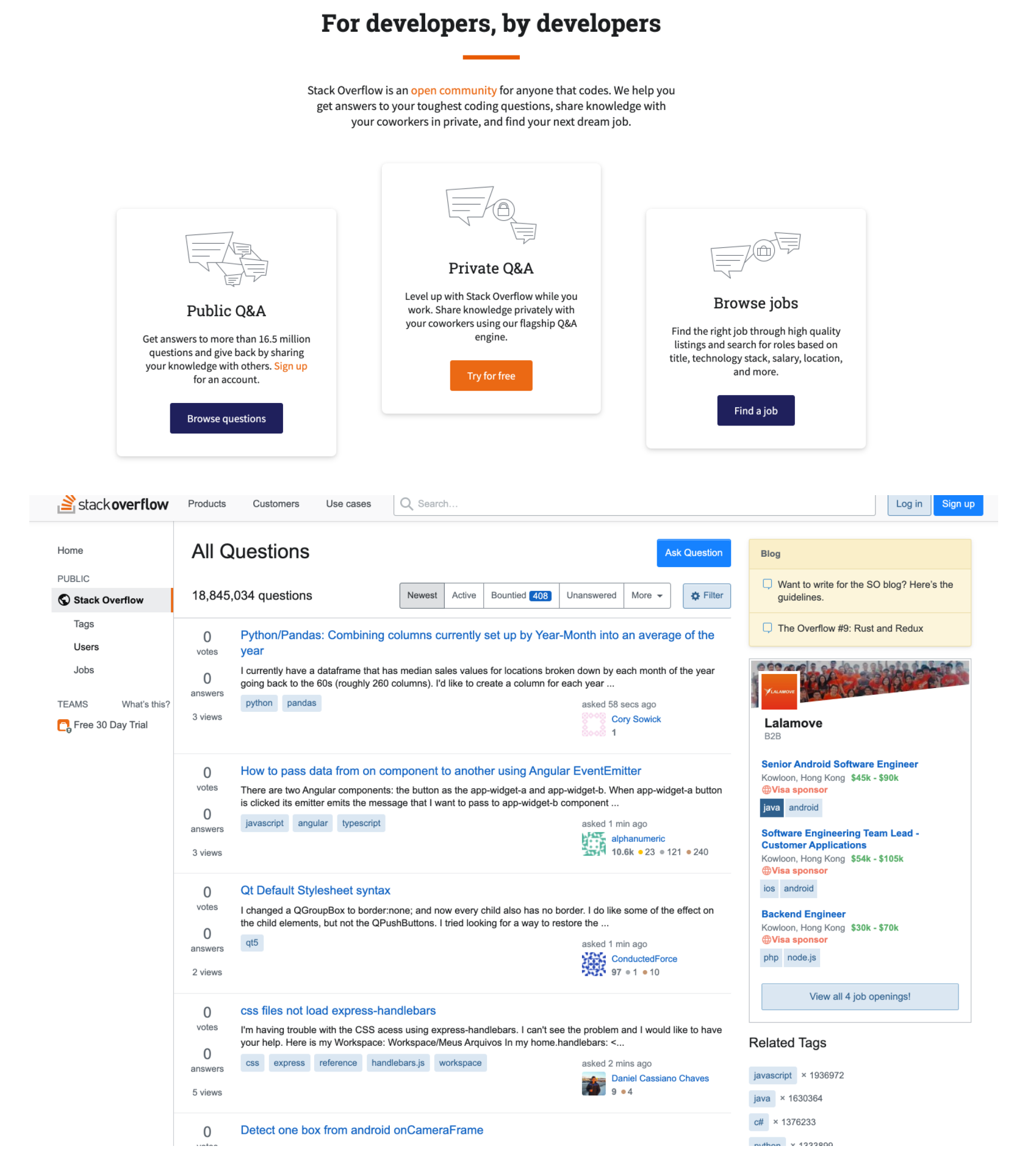 StackOverflow 是一个与程序相关的 IT 技术问答网站。用户可以在网站免费提交问题,浏览问题,索引相关内容,在创建主页的时候使用简单的 HTML。在问题页面,不会弹出任何广告,销售信息,JavaScript 窗口等。