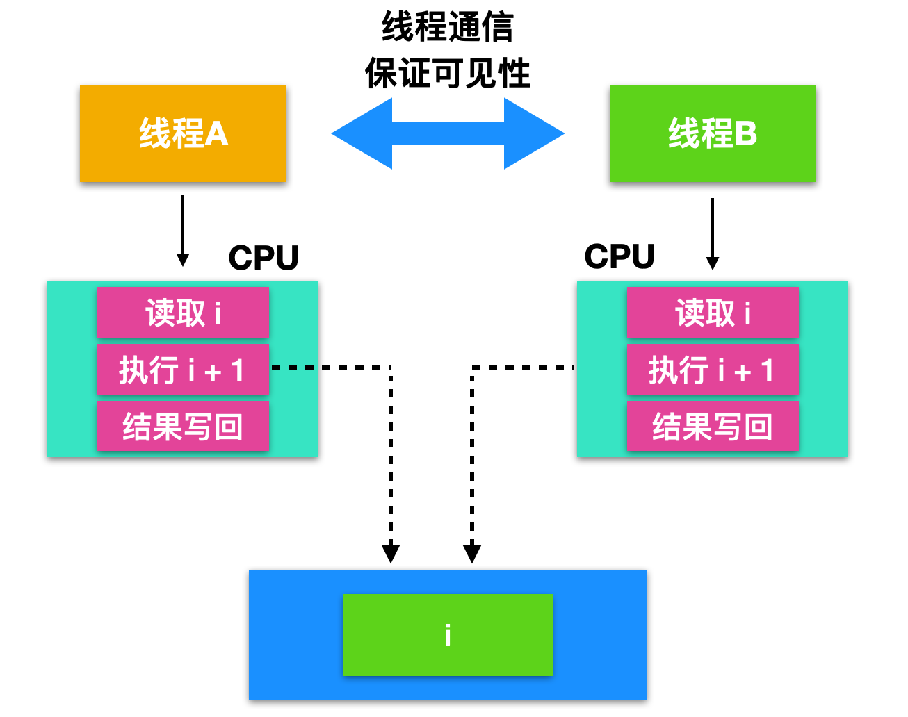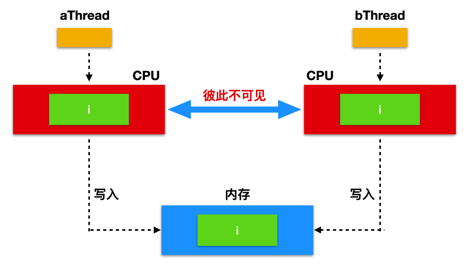当两个线程开始运行后,每个线程都会把 i 的值读入到 CPU 缓存中,然后执行 + 1 操作,再把 + 1 之后的值写入内存。因为线程间都有各自的虚拟机栈和程序计数器,他们彼此之间没有数据交换,所以当 aThread 执行 + 1 操作后,会把数据写入到内存,同时 bThread 执行 + 1 操作后,也会把数据写入到内存,因为 CPU 时间片的执行周期是不确定的,所以会出现当 aThread 还没有把数据写入内存时,bThread 就会读取内存中的数据,然后执行 + 1操作,再写回内存,从而覆盖 i 的值,导致 aThread 所做的努力白费。