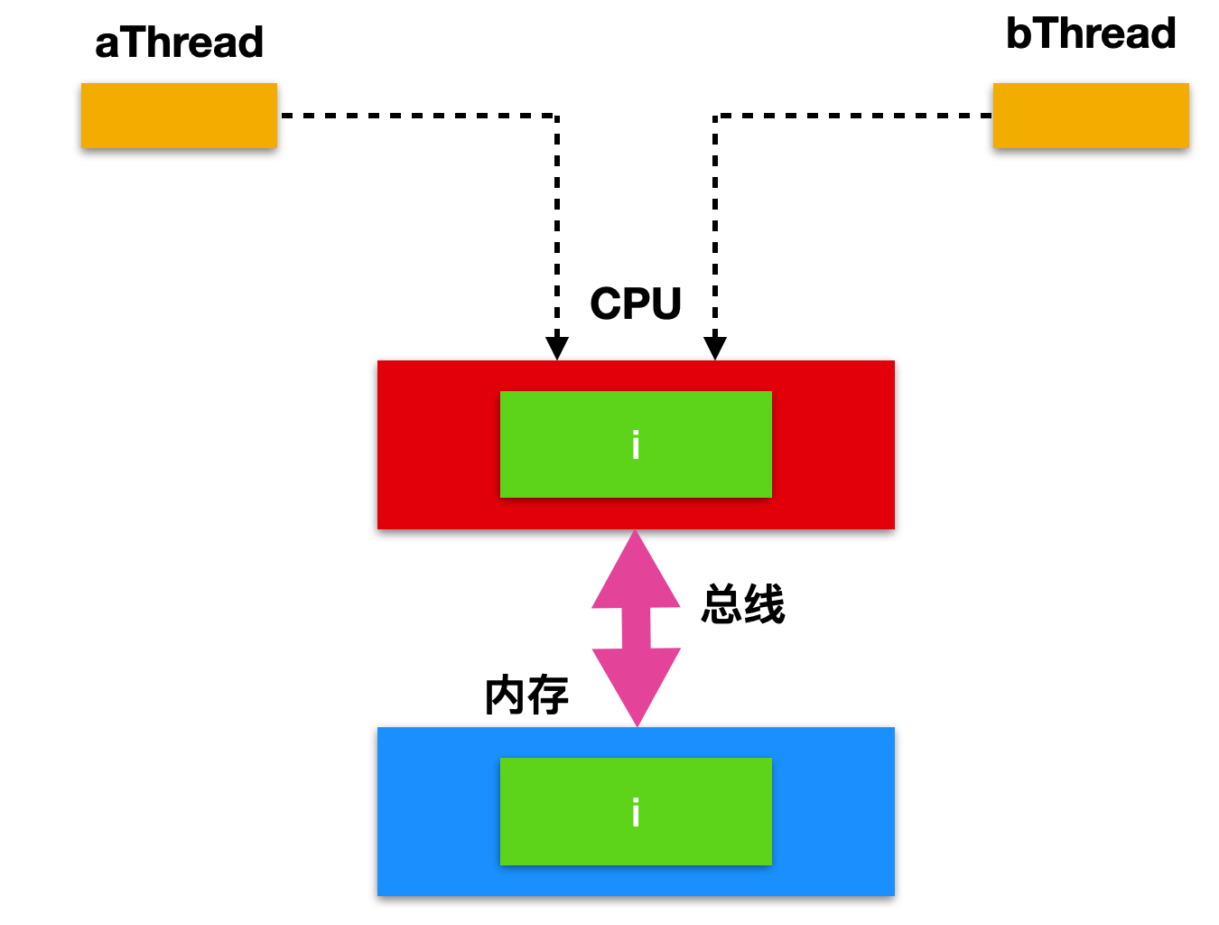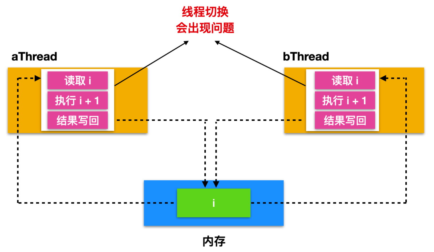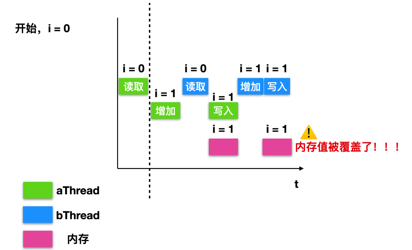最开始的时候,内存中 i = 0,aThread 读取内存中的值并把它读取到自己的寄存器中,执行 +1 操作,此时发生线程切换,bThread 开始执行,读取内存中的值并把它读取到自己的寄存器中,此时发生线程切换,线程切换至 aThread 开始运行,aThread 把自己寄存器的值写回到内存中,此时又发生线程切换,由 aThread -> bThread,线程 bThread 把自己寄存器的值 +1 然后写回内存,写完后内存中的值不是 2 ,而是 1, 内存中的 i 值被覆盖了。