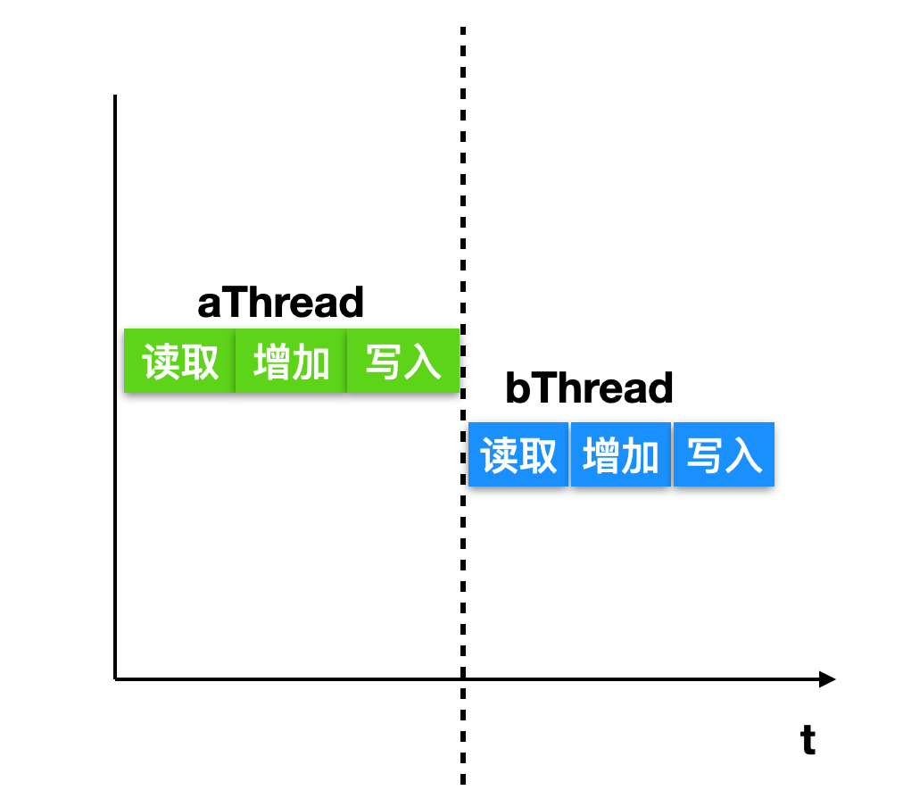可以看到,当 aThread 在执行完整个 i++ 的操作后,操作系统对线程进行切换,由 aThread -> bThread,这是最理想的操作,一旦操作系统在任意 读取/增加/写入 阶段产生线程切换,都会产生线程安全问题。例如如下图所示