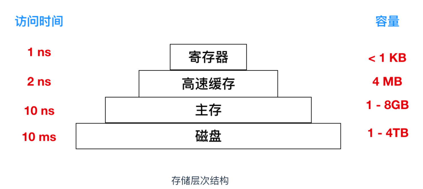 CPU 内部是寄存器的构造,寄存器的访问速度要高于高速缓存,高速缓存的访问速度要高于内存,最慢的是磁盘访问。