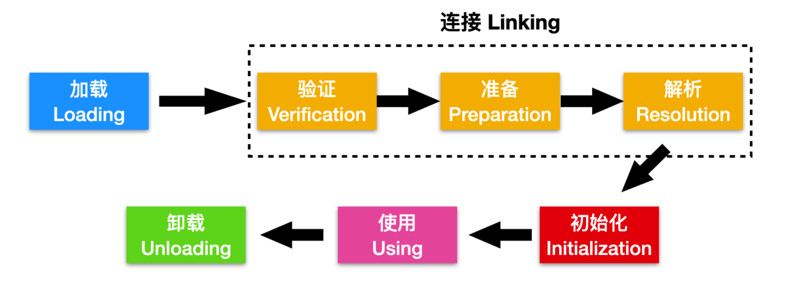 这是一个 JVM 加载类的过程图,也称为类的生命周期,类从加载到 JVM 到卸载一共会经历五个阶段 加载、连接、初始化、使用、卸载。这五个过程的执行顺序是一定的,但是在连接阶段,也会分为三个过程,即 验证、准备、解析 阶段,这三个阶段的执行顺序不是确定的,通常交叉进行,在一个阶段的执行过程中会激活另一个阶段。