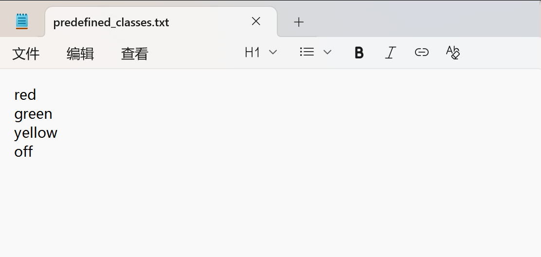 4、配置标注类别,打开labelimg路径下的data/predefined_classes.txt文件,将文件中的内容修改成自己的类名,尽量用英文字符。然后保存。