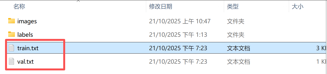4、运行完成后,打开datasets目录,可以看到多出了两个文件,train.txt和val.txt。