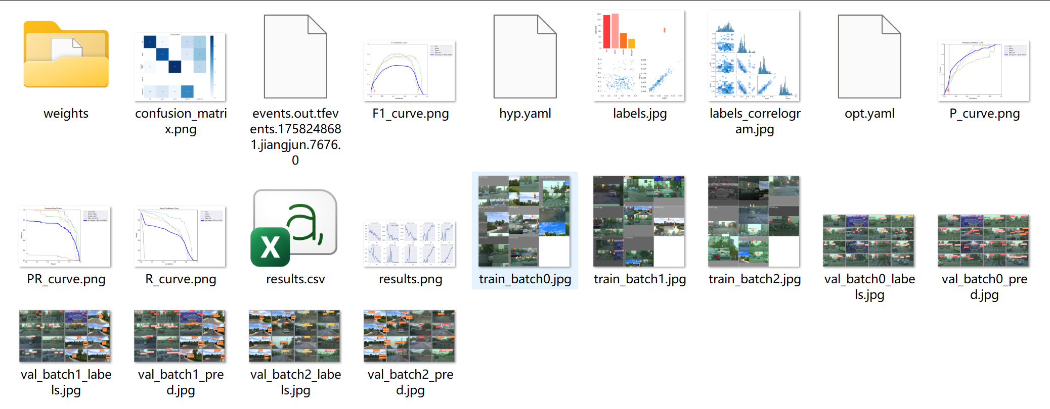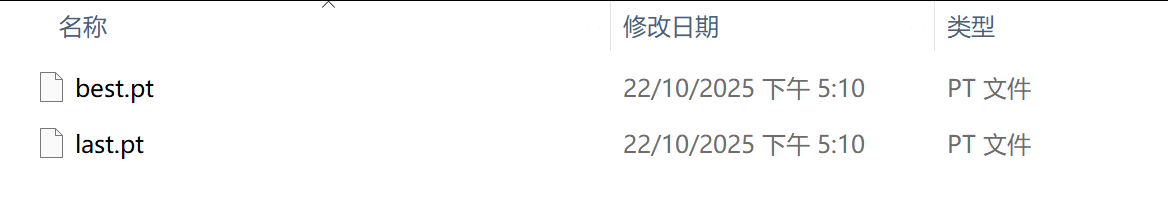 训练好的模型保存至weights目录中,best.pt为训练最好的模型,last.pt为最后一个epoch训练的参数。