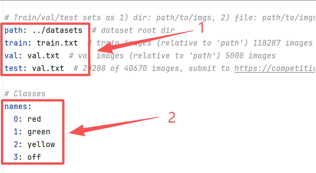 2、配置数据集。打开yolov5-master/data/coco.yaml文件,有两处需要修改,第一处修改数据集如下所示,第二处修改为自己的类名(和datasets/labels/classes.txt类名一致)。