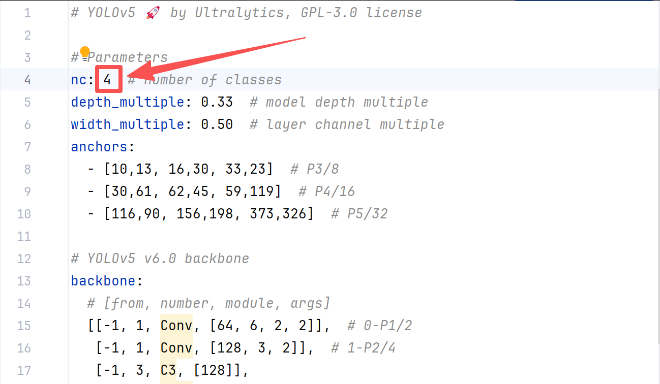 1、配置模型。打开yolov5-master/models/yolov5n.yaml文件,将文件中nc的值改为自己的类别数。我的项目中类别数为4,所以改为了4。可查看datasets/labels/classes.txt中的类别数进行设置。