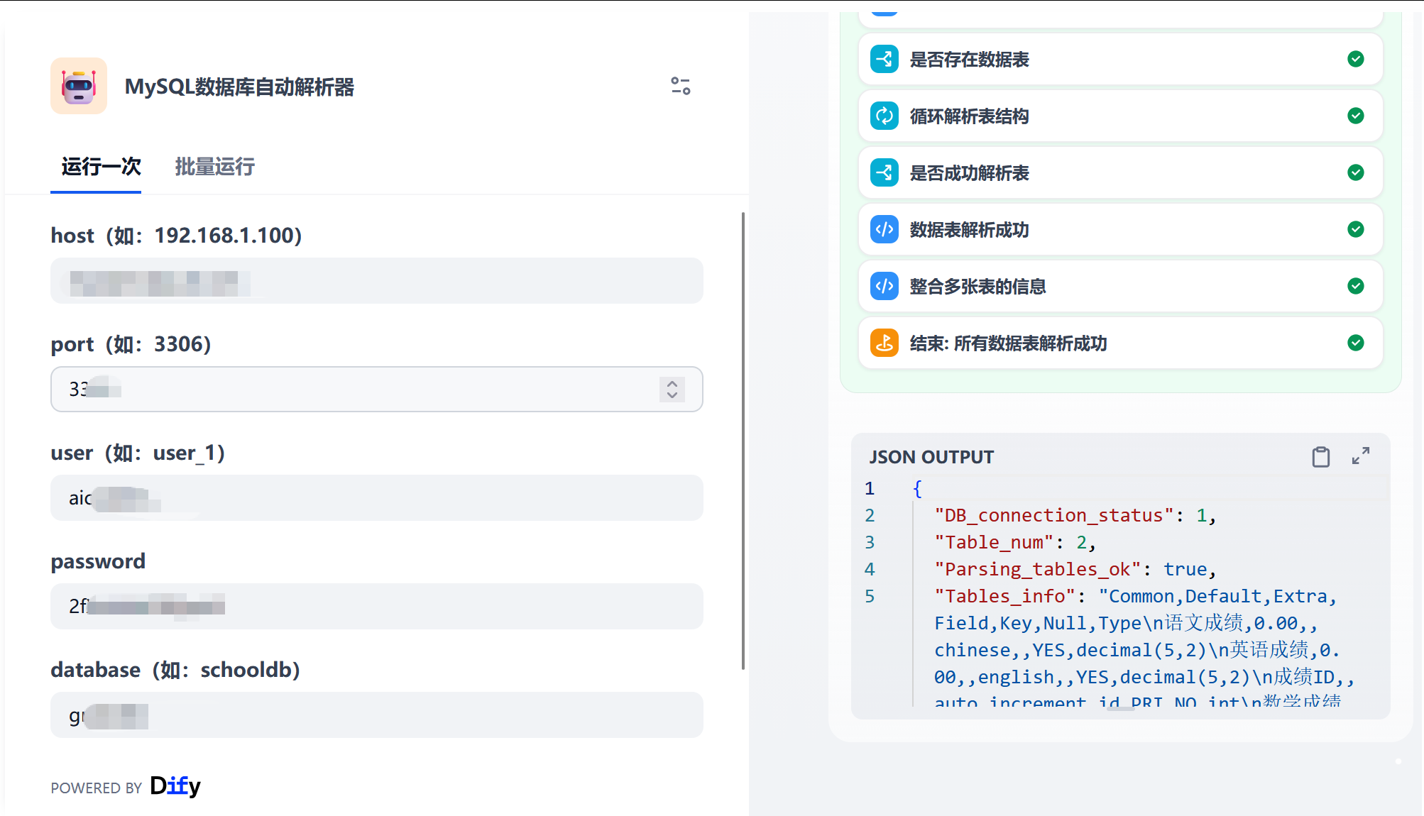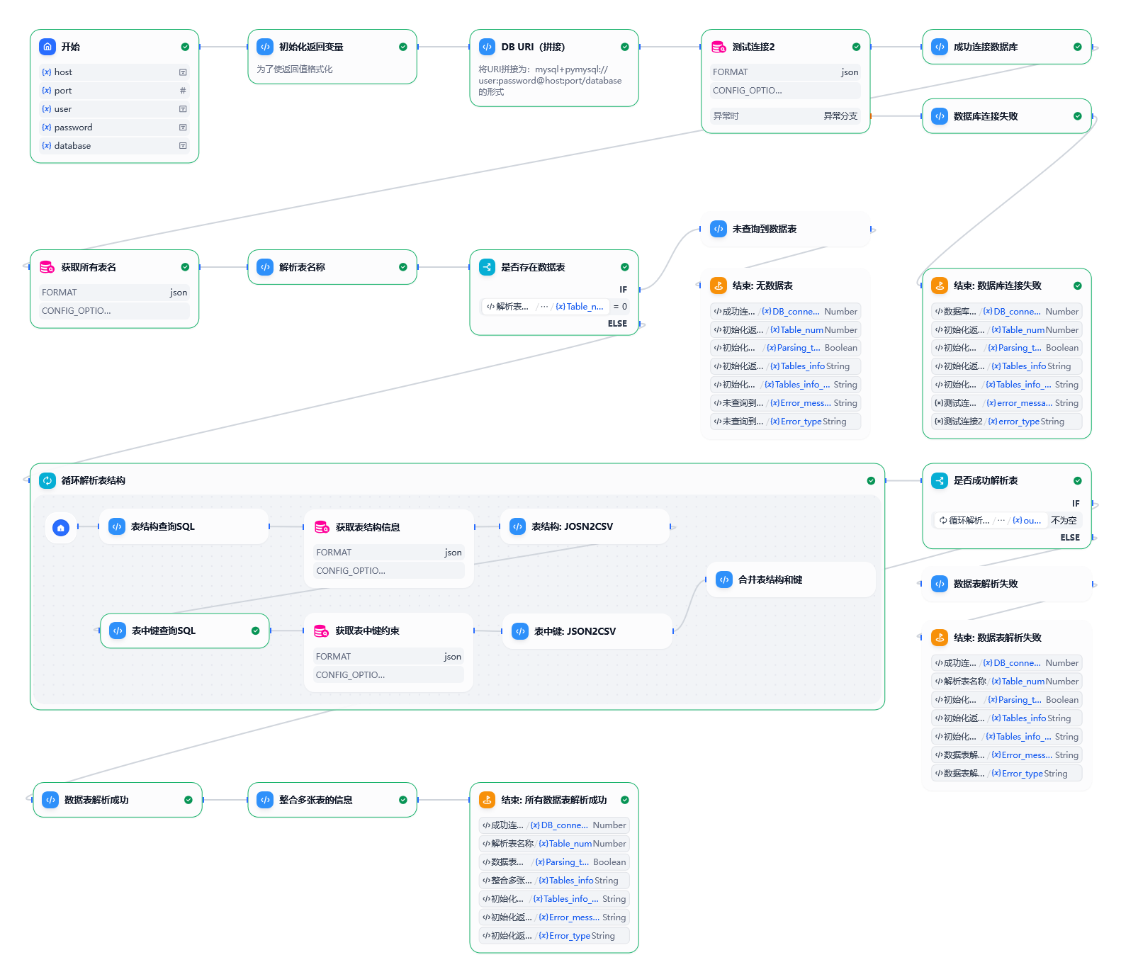 在dify智能体开发平台中,SQL工具只能执行SELECT语句,无法使用SHOW、DESCRIBE (DESC)以及SHOW CREATE等语句获取数据表的信息。想要使用大模型生成准确的SQL语句,只能由开发者先手动查看并梳理数据库结构,再将整理好的表信息输入给模型,极大地依赖人工操作。这一过程不仅效率低下,还容易因人为疏漏导致生成的SQL语句出现偏差。为了从根本上解决这一问题,我开发了一款能够自动解析MySQL数据库的智能体,实现数据库解析地自动化,可以显著提升基于dify的SQL构建的准确性与开发效率。